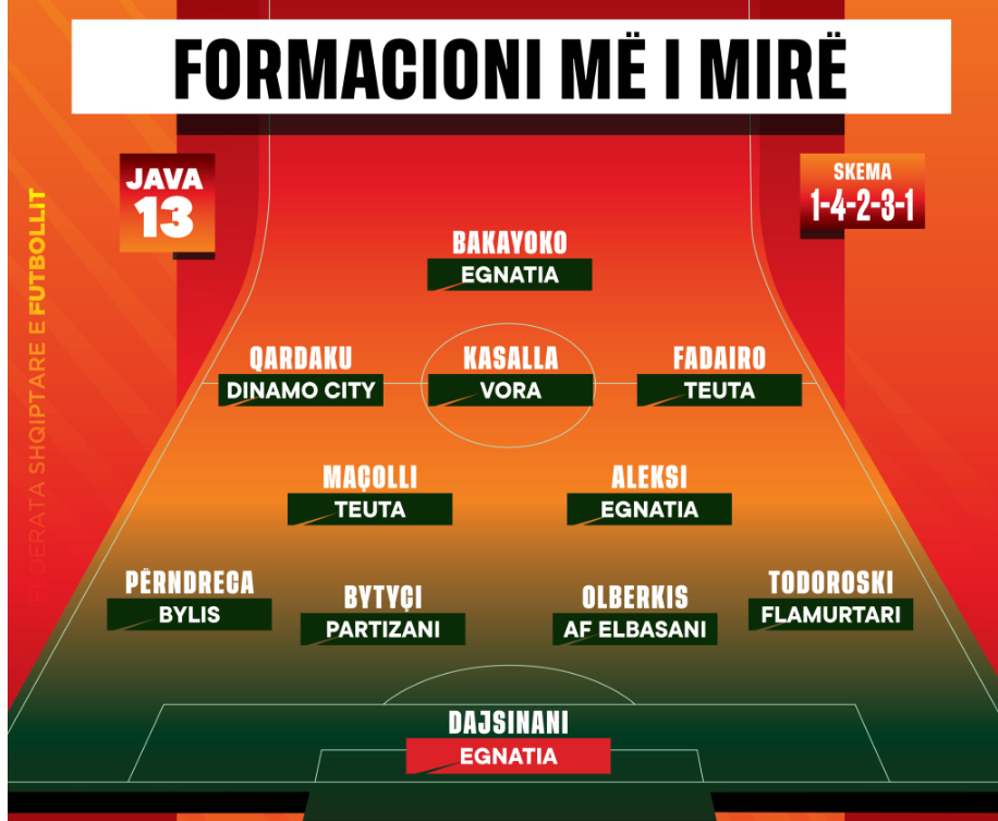 Pas përfundimit të javës së 13-të, trajnerët e ekipeve Kombëtare kanë përzgjedhur formacionin dhe trajnerin më të mirë, sipas skemës 1-4-2-3-1.