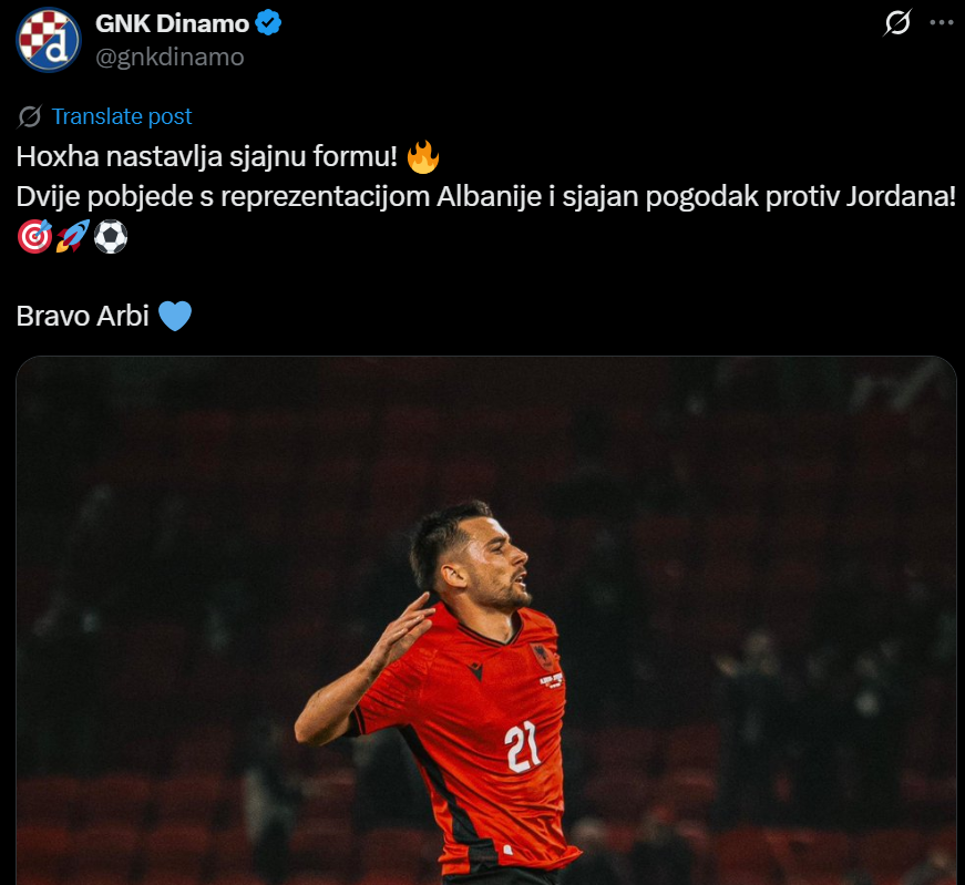 Ndërkohë urimi ka ardhur edhe nga Dinamo e Zagrebit. Kroatët kanë uruar Hoxhën për super performancën e zhvilluar me Shqipërinë teksa shkruajnë: “Hoxha vazhdon me formën e tij brilante. Dy fitore me Shqipërinë dhe një gol fantastik kundër Jordanisë”, shkruan klubi kroat. /Elio Hajdari-Sport Ekspres/
