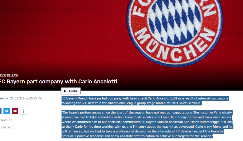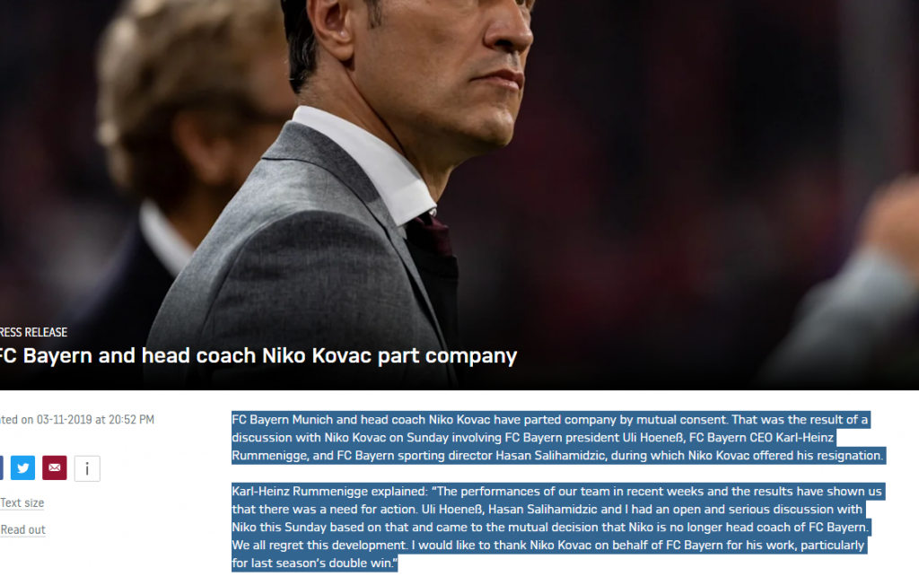 Kështu erdhi edhe shkarkimi i pashmangshëm. Por një detaj brilant është kapur nga mediat dhe vetë tifozët e Bajernit me deklaratën e shkarkimit për Kovaç. Më shumë sesa një mungesë kreativiteti, është një deklaratë e mbyllur brenda pak minutash, pasi është bërë “copy paste”. Kjo pasi ka të njëjtën ngjashmëri të madhe me shtatorin e 2017, atje ku do të largohej Karlo Ançeloti.