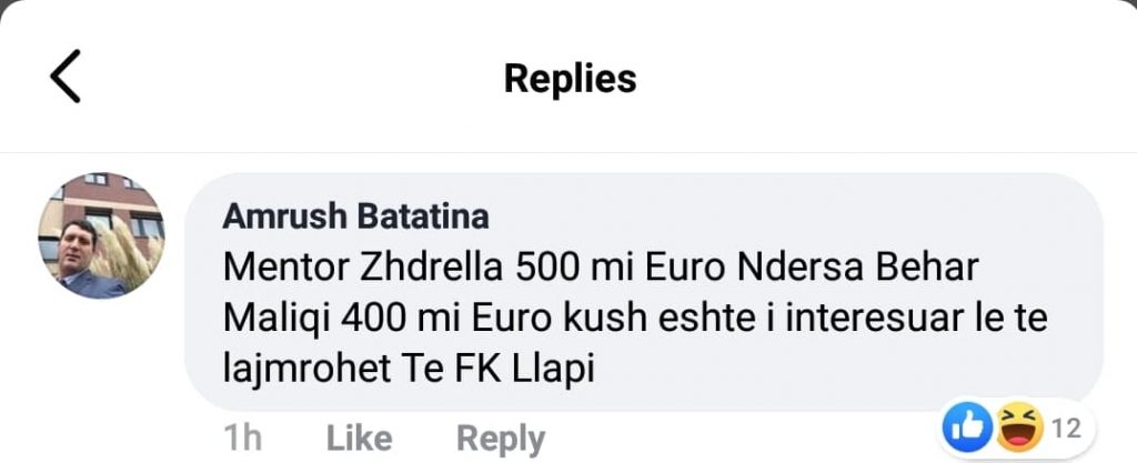 “Mentor Zhdrella 500 mijë euro, ndërsa Behar Maliqi 400 mijë euro kush është i interesum le të lajmërohet te KF Llapi”, ka thënë Amrush Batatina. /Sport Ekspres/