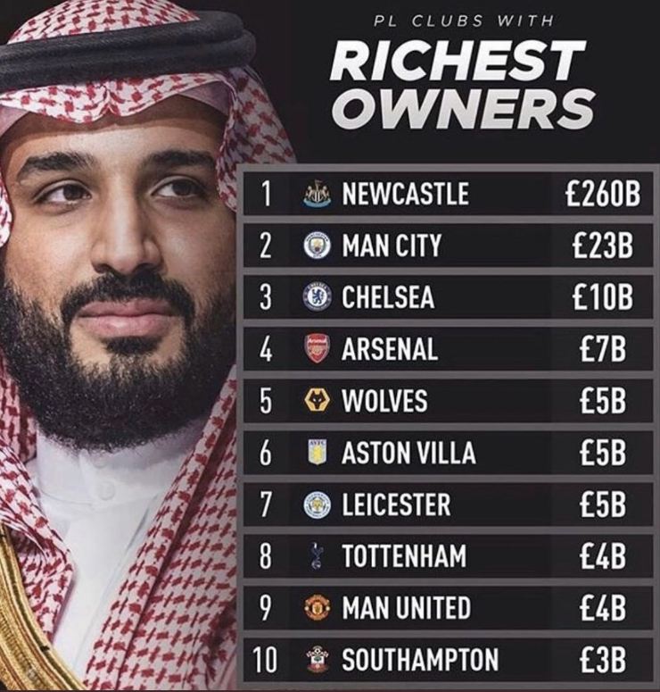 Mediat kanë bërë një llogari të pasurive që do të kenë klubet në Angli, ndërsa Neëcastle shkon në vendin e parë me 260 bilionë paund. Tërësisht një prishje e tregut kjo, ndërsa në vendin e dytë vjen Manchester City me 23 bilionë paund, Chelsea me 10 bilionë paund dhe Arsenali me 7 bilionë paund. /Sport Ekspres/