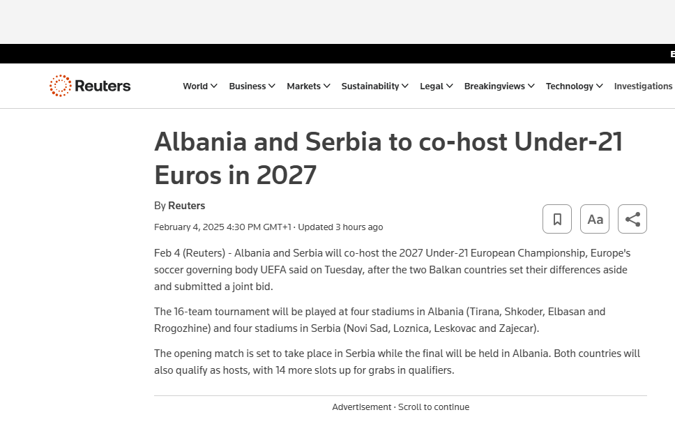 Ndërkohë Reuters ka vendosur në titull: “Shqipëria dhe Serbia presin Europianin”, për të treguar në po të njëjtën pikëpamje, të shkuarën dhe të ardhmen. Ndërkohë media greke, “Gazzetta.gr”, shkruan se pavarësisht historisë së ditur mes shqiptarëve dhe serbëve, Federata e Futbollit kanë vendosur që të bëjnë një hap përpara.