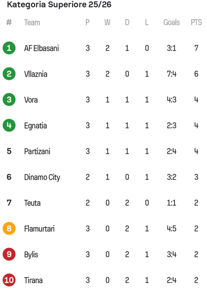 Fill pas tyre vjen Vllaznia me vetëm një pikë më pak. Ndërkohë 4-shen më të mirë e plotëson Vora me Egnatian me nga 4 pikë secila. Vlen të theksohet se Dinamoja dhe Teuta ende nuk kanë zhvilluar sfidën e prapambetur mes tyre, e cila ishte e vlefshme për javën e parë të “Abissnet Superiore”-s./Sport Ekspres/