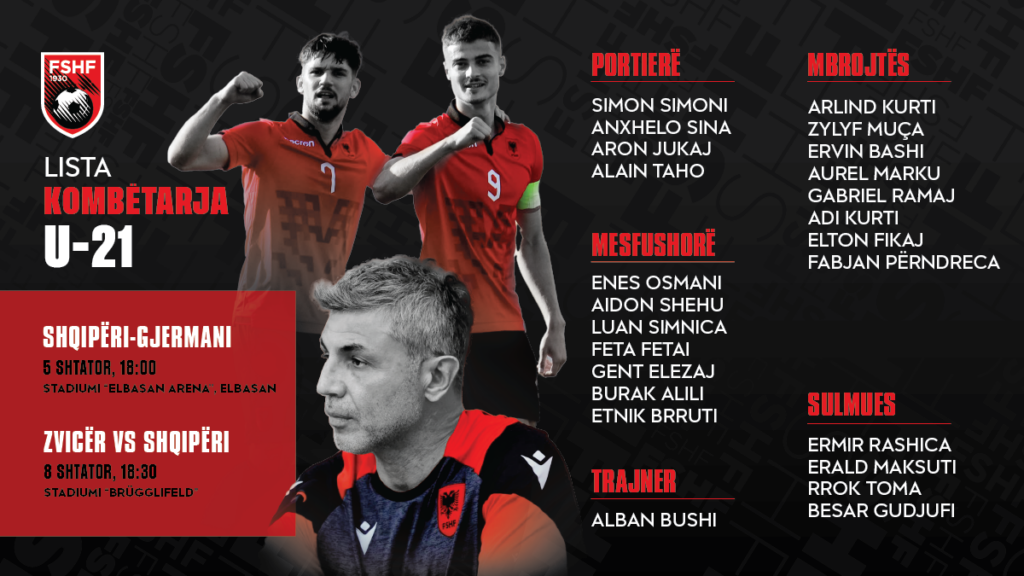 Trajneri i Kombëtares U-21, Alban Bushi, ka shpallur listën me 23 lojtarët e ftuar për dy ndeshjet miqësore që do të zhvillohen në muajin shtator ndaj Gjermanisë dhe Zvicrës.