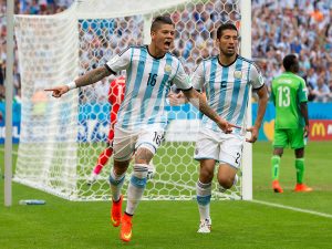 Marcos Rojo of Argentina celebrates scoring a goal after making it 3-2