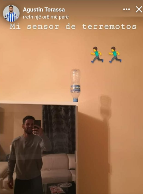 Bëhet fjalë për Agustin Torrasën, që nëpërmjet një foto në “Instagram” tregon edhe sensorin e tij të tërmetit. Mbi pasqyrë ka vendosur një bidon me ujë, duke zgjedhur që ta kalojë me këtë mënyrë humoristike gjithë kaosin e madh që mbërtheu vendin tonë. /Sport Ekspres/