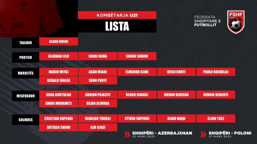 Kombëtarja U-21 do të nisë pas pak ditësh përgatitjet për dy miqësoret e muajit mars të programuara ndaj Polonisë dhe Azerbajxhanit. Trajneri i Shqipërisë U-21, Alban Bushi ka shpallur ndërkohë edhe listën me emrat e 24 lojtarëve që do të ftohen për këto dy miqësore.