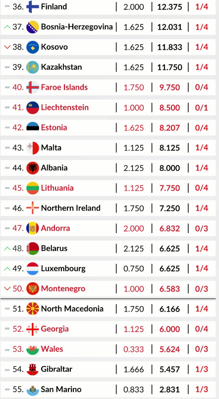 Ndërkohë në vendin e 41 gjendet Lihtshejni me 500 pikë më shumë se Shqipëria dhe ky pozicion mund të kapet nëse Dinamo arrin në fazën e grupeve të Conference League pasi Lihtshtejni nuk ka më ekipe të mbetura në Europë këtë sezon. Dhe maksimumi që mund të arrijë Shqipëria në këtë edicon mes sukseseve të Dinamos është një ecuri e mirë e ekipit të Dajës në grupe që mund të na rendiste të paktën në vendin e 40 atje ku ndodhet Ishujt Farao me 1.750 pikë më shumë se Shqipëria, por me 0 ekipe të ngelura në këtë edicion. /Sport Ekspres/