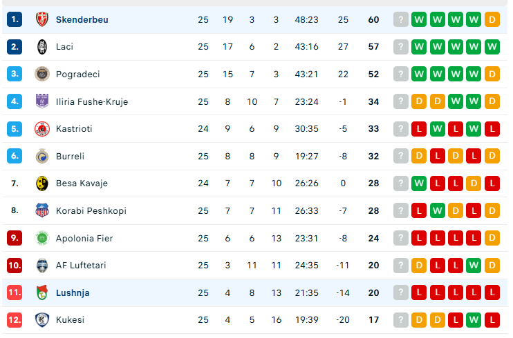 Me këto tre pikë të marra, korçarët mbajnë vendin e parë me 60 pikë të grumbulluara. Në vendin e dytë vjen Laçi me 57 pikë, i cili sot fitoi ndaj Apolonisë me rezultatin 2-1. Ndërkohë Pogradeci që vjen në vendin e 3 me 52 pikë, sot ka arritur të fitojë në mënyrë spektakolare ndaj Korabit, 4-1. Me këtë renditje duket qartë se Skënderbeu dhe Laçi do të ngjiten menjëherë në Superiore, ndërsa Pogradeci do të provojë edhe njëherë tjetër shijen e Play Off. /Sport Ekspres/