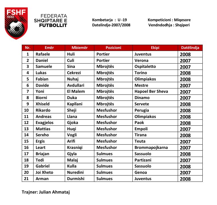 Kombëtarja U-19 nis sot grumbullimin në kuadër të dy ndeshjeve miqësore kundër bashkëmoshatarëve të Irlandës. Trajneri Julian Ahmataj ka përzgjedhur 21 futbollistë për këto dy takime, që do të zhvillohen më datat 10 dhe 12 tetor, në orën 11:00.