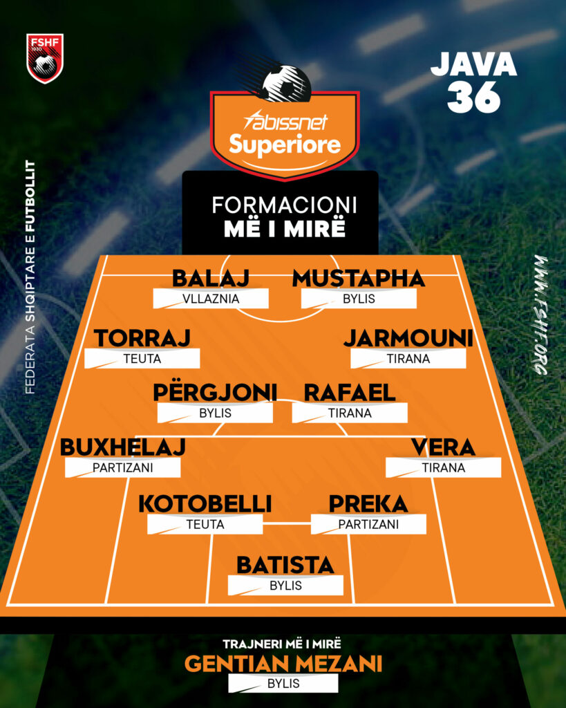Katërshja e mbrojtjes përbëhet nga Paulo Buxhelaj (Partizani), Blerim Kotobelli (Teuta), Marcelino Preka (Partizani) dhe Luciano Vera (Tirana).