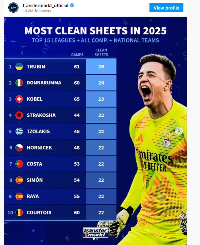 Por në të gjitha rastet, janë vetëm për shkak se kanë një numër më të madh ndeshjes. Vendi i parë që mbahet nga Trubin janë llogaritur 61 ndeshje ku në 26 takime ka mbajtur portën e paprekur. Ndërkohë Strakosha me 44 ndeshje, ka mbajtur 22 herë portën e paprekur. Nëse mban të njëjtën mesatare, do të thotë se Strakosha nëse do të kishte 61 ndeshje në dispozicion si Trubin, do të ishte padyshim vendi i parë. /Sport Ekspres/