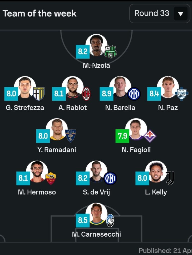 Titullar në këtë sfidë ishte edhe Ylber Ramadani, i cili ka spikatur në fushën e lojës. Paraqitja e tij u vlerësua me notën 8 nga “Sofascore”. Një vlerësim që e ka renditur atë mes 11 më të mirëve të javës së 33-të të kampionatit në Serinë A./Sport Ekspres/